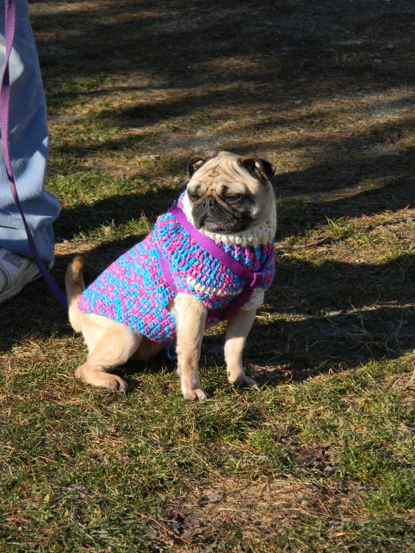 I bought Aaron's bus ticket home today. He will be coming home on the 21st. Yesterday I made a sweater for my puggie - pic: (of course, this was BEFORE I had made the arms)
