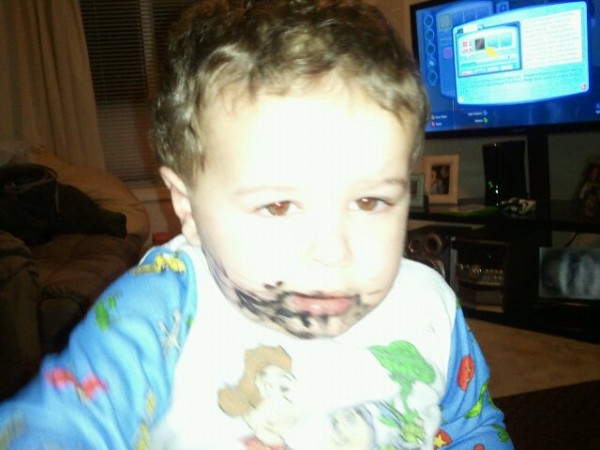 Saturday night Beth (my sister) came over to hang out. We put Cameron down to bed and Chris went up to check on him (he was in our bed because he was sick) and Chris brought him down put him on my lap and said LOOK AT HIM!!! Cam decided to to paint his face with mascara and eat it.