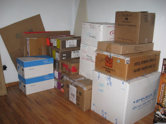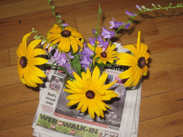those are fresh flowers from josh's yard, partly to apologize for something stupid he did, and partly because they're pretty. they're sitting on a big stack of newspapers that i'd asked him to bring home so i can start packing fragile stuff. |