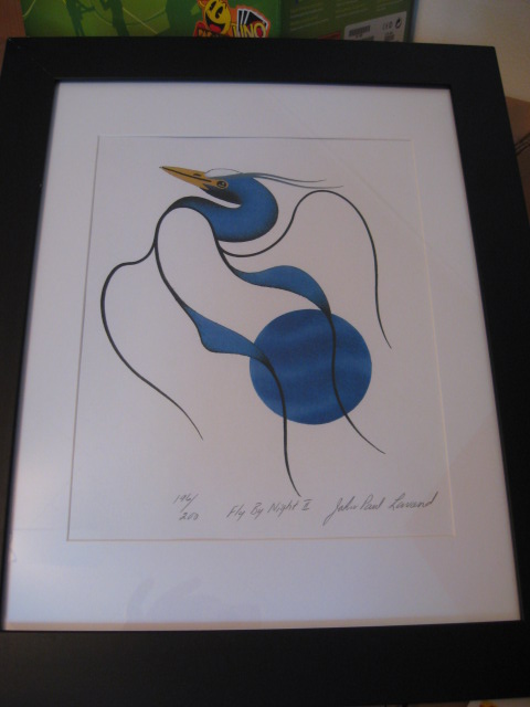 speaking of dinners, my going away dinner for work was thursday night. it was pretty decent. my manager made no secret that she wasn't impressed with my choice of restaurant, what people were wearing, etc., but i got over it (and i think she did too, once the wine got to the table). i was presented with a couple of beautiful gifts, and will certainly think of kenora when i put them in my new apartment in toronto. one is a lovely limited edition line drawing/painting done by a local artist.