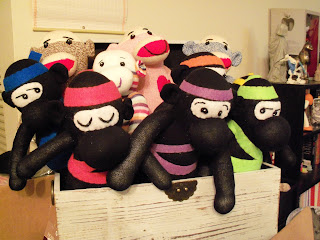 Target had some great sock monkey socks this week, so I got tons of those this weekend, and I've got lots and lots of monkeys for both the Etsy shop and the craft fair. The holiday monkeys (both Christmas and Hanukkah ones!) won't just be regular monkeys, they'll come dressed for the weather in little hats and scarves... a long with a special winter surprise!