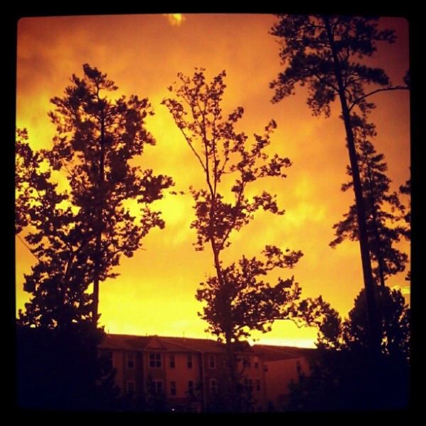 We had a wicked storm here today. Like thunder rumbling right under the feet and lightening flashing like strobe lights and winds throwing the trees around outside. The most annoying thing about it all? Our house's little dog, Honeybee (8 pounds soaking wet), was shaking the entire couch and panting as loud as an elephant (if they ever panted). But the aftermath of the storm was beautiful - rainbows, clouds, an awesome sunset were spotted by my local FB friends. What do I see? An eerie orange twilight straight out of a Halloween movie. Ha! (Picture below) It was still strangely beautiful. I love this Creation!