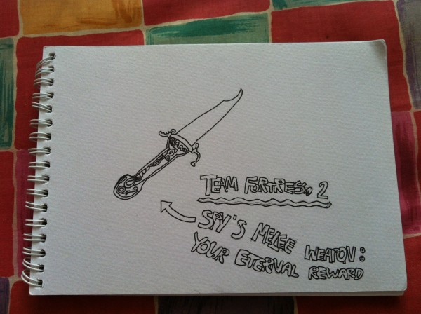 Well, I guess I changed my mind about uploading photos/artwork on the last two entries. ^^" I'll upload a drawing of mine here, though. I'm gonna upload the first drawing I ever did. It's called "TF2 - Your Eternal Reward".