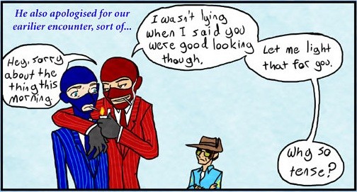 P.S. Think I'll upload a panel of the TF2 fancomic that Kytri drew. Has Blu Spy (Jordi), Red Spy (Gabry), and Blu Sniper (Liam) in it. :3 Is called "Cuanta Vida - Why So Tense?".
