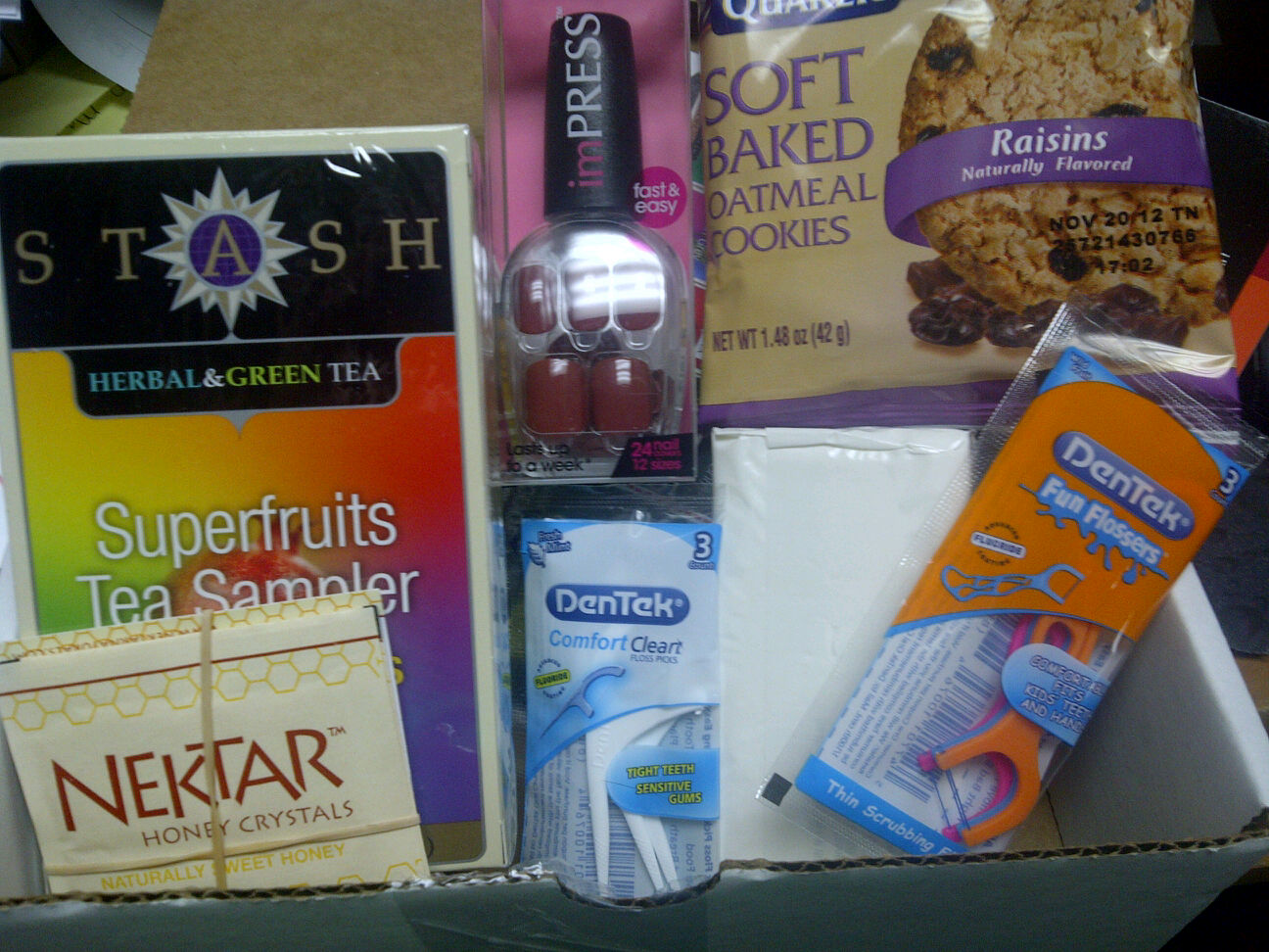 Ivory bar soap, DenTek comfort clean and fun flossers, Stash Tea Superfruits tea sampler and nektar sweetener, Quaker soft baked cookie, imPRESS press-on manicure by Broadway Nails.